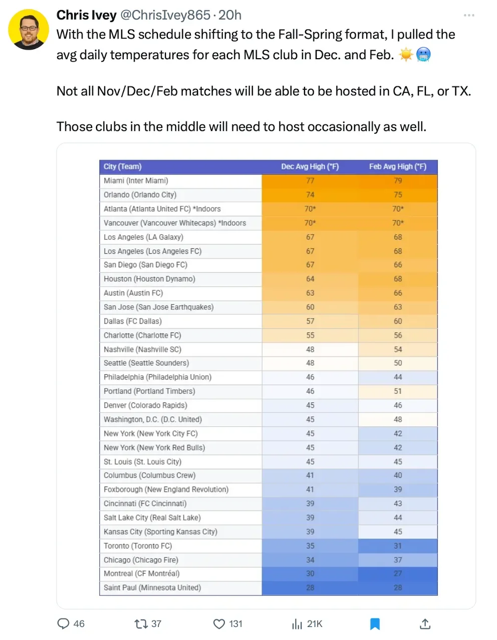 One of the issues that the league runs into is its geographic size. That’s usually a hindrance in terms of travel, but now the league can use that to its advantage. They can schedule the coldest weather areas on the road at the end/beginning of the winter break and use climates like Austin, Houston, and Miami, or dome cities like Vancouver and Atlanta to balance things out.