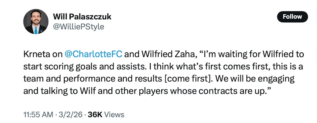 Wilifred Zaha, The 33 year old former Crystal Palace striker, is still in Charlotte on loan (at least through June) from Turkish club Galatasaray. He had 15 goal involvements last year and is one of the league leaders in drawing fouls (a skill he’s always possessed). Charlotte’s GM Zoran Krneta is looking for more from him: